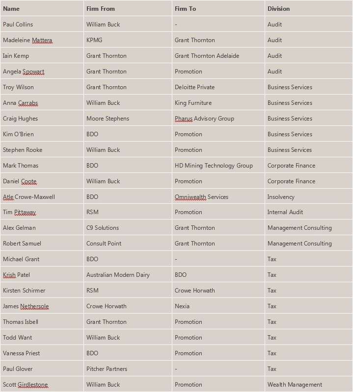 Tax, Business Services and Audit accounted for 70 percent of the Partner moves. Unsurprisingly the majority of moves this year were from rival mid-tier firms, with only one Partner moving from the Big 4 (Madeleine Mattera, Audit at Grant Thornton). While there has been a high number of Partner moves in Sydney, all indications point to there being further Partner moves before the end of the calendar year.